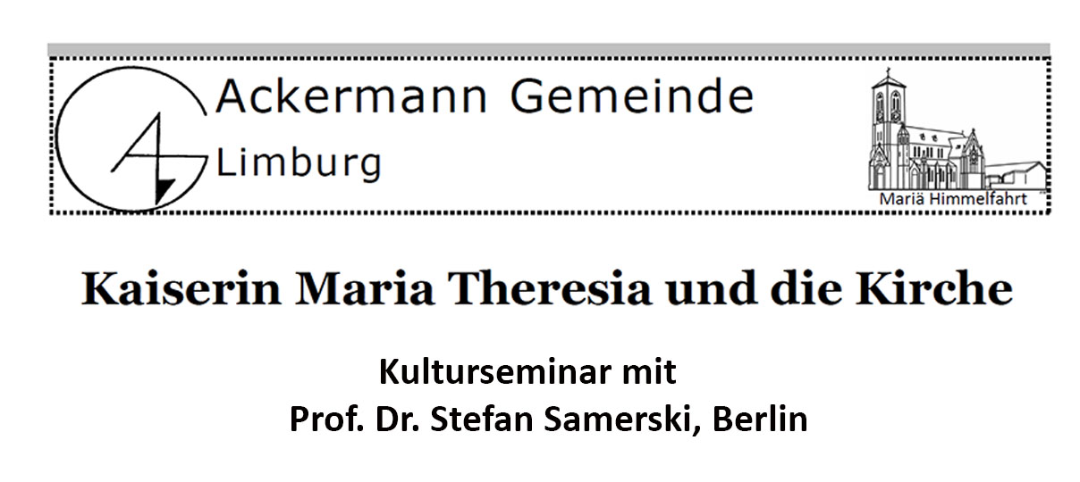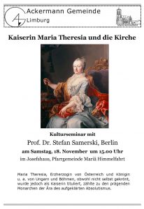 Am Samstag, dem 18. November lädt die Ackermanngemeinde im Josefshaus zu einem Seminar mit Prof. Dr. Stefan Samerski, Berlin zum Thema Kaiserin Maria Theresia und die Kirche ein. Näheres entnehmen Sie bitte dem Plakat links.